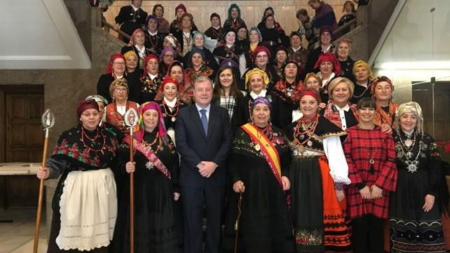 El alcalde Silván rodeado de buena parte de las 50 águedas hoy en el Consistorio leonés.