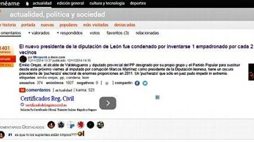 Así que de las 127 noticias enviadas por los usuarios de ileon.com las dos más 'meneadas' no se encuentran, curiosamente, entre las diez más leídas desde esta Red Social de Noticias. En concreto, la primera, con más de mil cuatrocientos 'meneos', fue la noticia de que el nuevo presidente de la Diputación (el que sustituyó a los dos anteriores, la asesinada Carrasco y el hoy diputado no adscrito Marcos Martínez Barazón), había 'inflado' el censo de su pueblo: Emilio Orejas fue condenado por inventarse 1 empadronado por cada 2 vecinos en las elecciones. La siguiente, con más de mil, también tiene que ver con la institución provincial ya presidida por su sustituto, Marcos Martínez (que resultó ser al final la gran protagonista de 2014 en Menéame, entre las ferocísimas críticas por corruptelas por parte de sus usuarios): Correos electrónicos prueban una relación de la trama corrupta 'Púnica' con la Presidencia de la Diputación