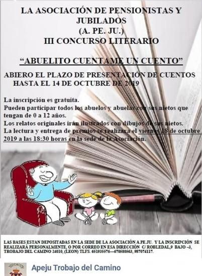 La Asociación de Pensionistas de Trobajo del Camino convoca el III concurso 'Abuelito cuéntame un cuento'. Un concurso con inscripción gratuita en el que pueden participar todos los abuelos y abuelas y sus nietos que tengan una edad comprendida 0 a 12 años. Los relatos originales irán ilustrados con los dibujos de sus nietos.
