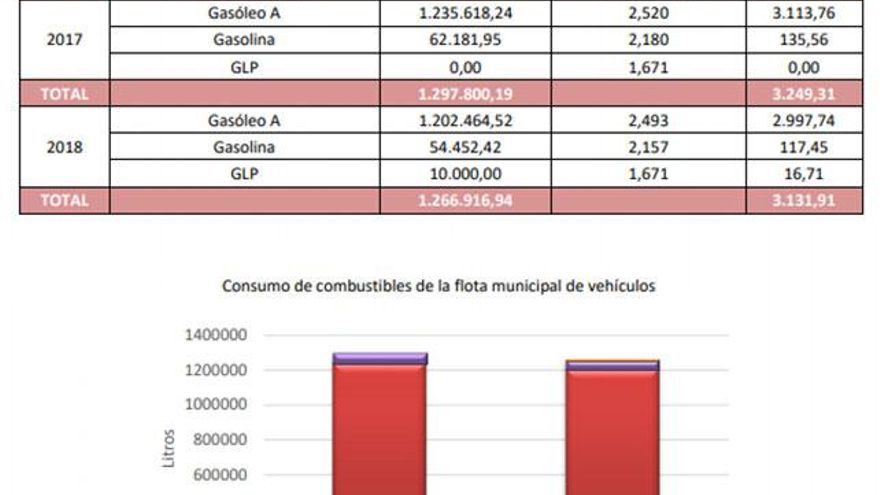 De 754.687 toneladas en 2015 a 726.631 (un 3,72% menos), ya que para hacer la comparativa no han contabilizado “otros combustibles fósiles expresado en cálculos anteriores dado su bajo nivel de especificidad [...] ni los consumos de gasóleo B y fuelóleo”, puesto que no se contemplaban en el cálculo de 2015 y 2016.