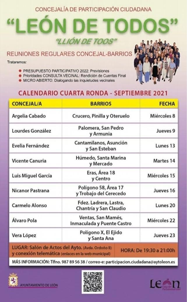 Esta cuarta ronda, en la que se combinará la forma presencial (Salón de Actos del Ayuntamiento de León) con la telemática, se informará de las previsiones del presupuesto participativo y se dará cuenta de las prioridades marcadas por los vecinos en la consulta vecinal. Además, se ofrecerá parte del tiempo para que los vecinos comenten sus inquietudes y necesidades.