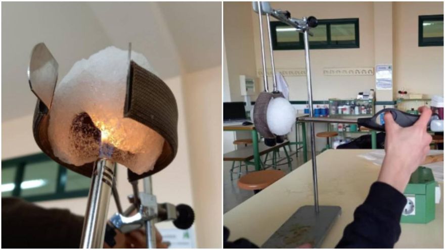 Con este y otros ingeniosos experimentos, los alumnos del IES Modesto Navarro desmintieron el bulo de la nieve de plástico.