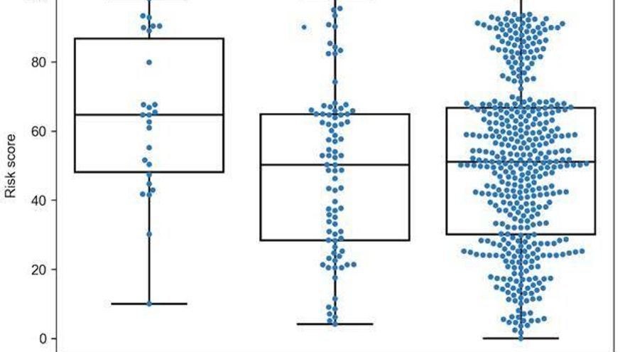 La puntuación de riesgo sugerida por los investigadores (eje vertical) es considerablemente más alta en el grupo de pacientes que sufren covid-19 grave (muestra de pacientes de Moscú). / S. Nersisyan et al.