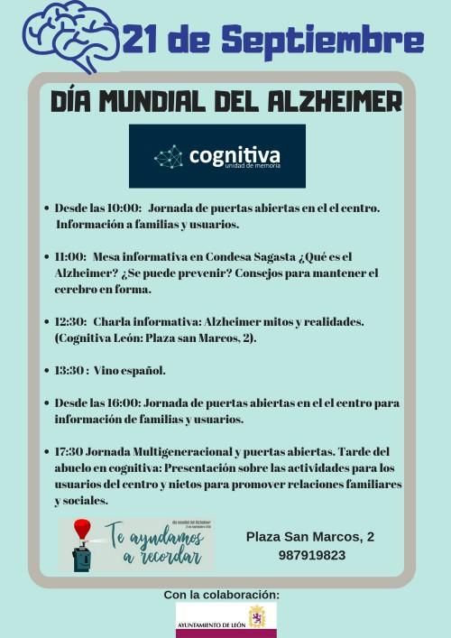 sensibilización y jornadas de puertas abiertas que irá realizando a lo largo del curso. Además, en colaboración con el Ayuntamiento de León, Cognitiva León ofrecerá una charla este viernes, 21 de septiembre, para conmemorar el Día Mundial del Alzheimer.