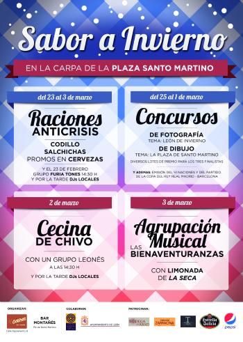 Lo más característico de León en una carpa. 'Sabor a Invierno' es una iniciativa de la cervecería Cosmos y el bar El Montañés para -reivindicando lo más típico de León, que es el frío- sacar también a la calle los productos de León. Una carpa, ubicada en la plaza Santo Martino, albergará hasta el 3 de marzo conciertos de grupos leoneses y djs locales mientras los leoneses pueden degustar cecina de chivo o tomar vinos de León y El Bierzo.