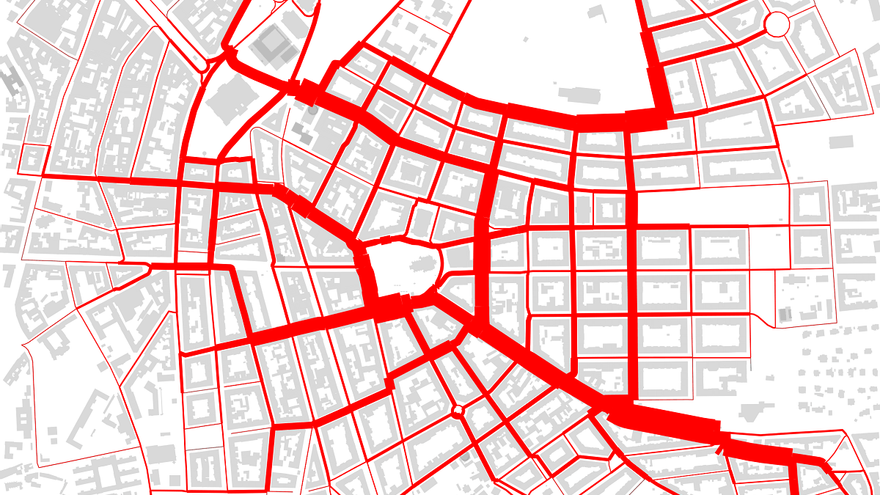 Una simulación de 1000 recorridos aleatorios en la ciudad de Praga. // Ed Manley.