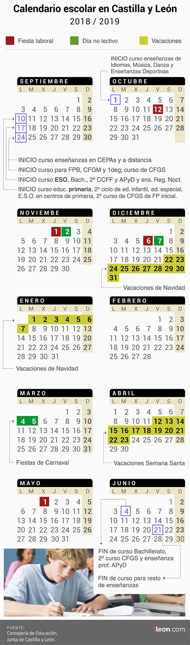 En cuanto a las pruebas extraordinarias o finales, en el calendario escolar publicado el pasado 24 de abril en el Boletín Oficial de Castilla y León (Bocyl), se indican dos periodos diferentes, los correspondientes al curso académico 2017-2018 y que se celebrarán a lo largo de mes de septiembre de 2018, con la siguiente distribución temporal: las pruebas extraordinarias, finales o la segunda sesión de evaluación final, en su caso, para el alumnado de Educación Secundaria Obligatoria, primer curso de Bachillerato en régimen ordinario y nocturno, ciclos en modalidad presencial de FP Básica, de Grado Medio y de primer curso de Grado Superior, se realizarán los días 3, 4 y 5 de septiembre de 2018.