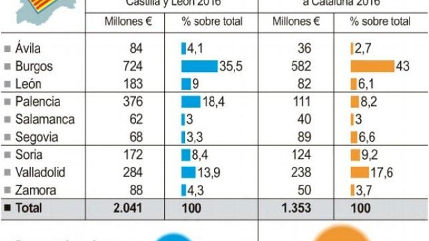 A la inversa, la provincia de Castilla y León que más productos vendió en Cataluña en año pasado fue la burgalesa, con 582 millones de euro, seguida por la vallisoletana, con 238 millones; y la soriana, con 124, y la palentina, con 111. Asimismo, la provincia de León vendió en Cataluña 82 millones en productos; Zamora, 50 millones; Salamanca, 40; y Ávila, 36.