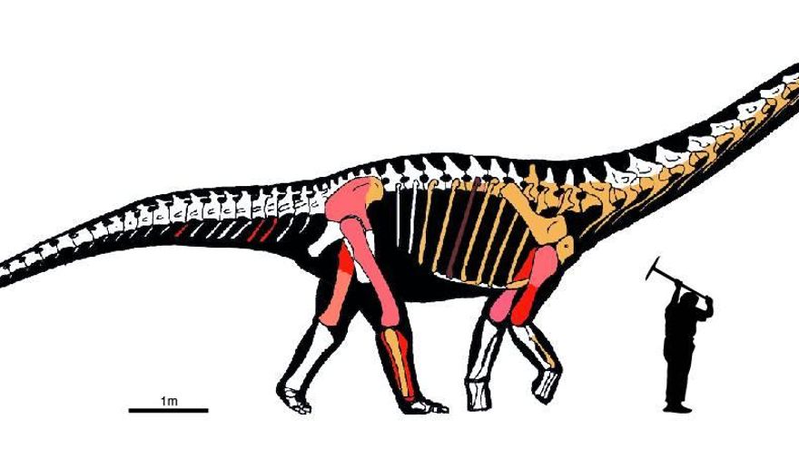 Silueta de Abditosaurus kuehnei en la que se muestran en distintos colores los restos excavados en distintas campañas de excavación. El color rosa claro corresponde a fósiles excavados en el siglo pasado y que se han perdido. // Bernardo González Riga