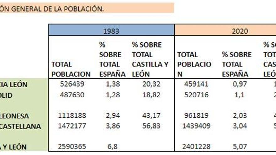 Si situamos las referencias de población en el conjunto de España tenemos que en 1.983 las tres provincias de la Región Leonesa suponían un 2,94% del total de España, hoy en el 2020 tan sólo son el 2,03. La provincia de León no llega al 1% de los habitantes de España (0,97%) cuando al inicio de la delimitación autonómica actual representaba un 1,38% de la población española. Pero es que esto es además tendencia ya que en el 2018 el número de habitantes de la Región Leonesa sobre el conjunto de España era del 2,05. Es decir progresivamente se va reduciendo ese porcentaje.