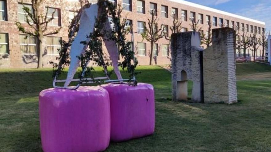 Un soporte triangular metálico, encaramado en lo que parecen dos pacas de paja forradas de un llamativo color rosa, sustenta la escultura que ha dejado indiferentes a pocos de entre quienes la vieron este domingo o se la han encontrado al acudir a clase en este arranque de semana.