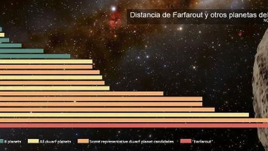 Farfarout está incluso en un lugar más remoto que el anterior poseedor del récord de distancia en el sistema solar: 'Farout' (muy lejano), ya que este está a 124 au del Sol. Fue descubierto por el mismo equipo y se le designó provisionalmente como 2018 VG18 Pincha en la infografía de abajo para verla más grande].