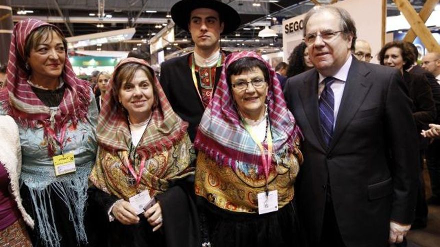 Juan Lázaro / ICAL El presidente de la Junta, Juan Vicente Herrera, visita el stand de Castilla y León, instalado en Fitur. En la imagen junto a unas mujeres con el traje Maragato.