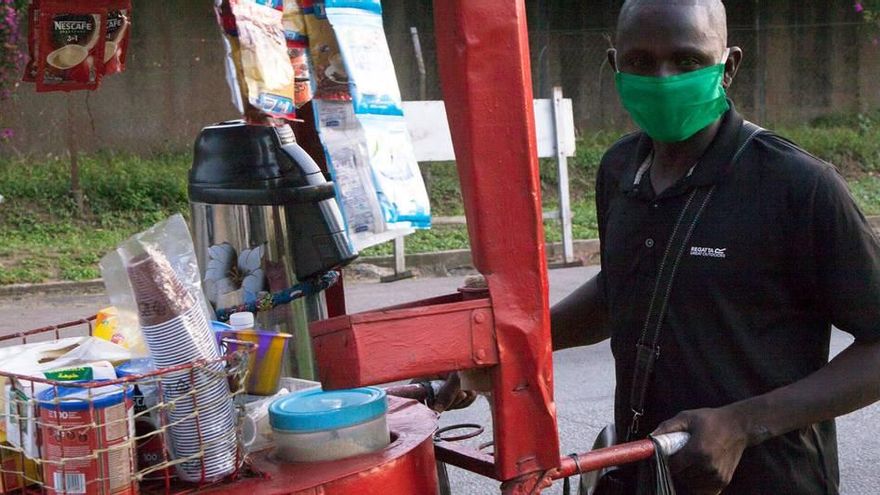 Un vendedor informal de Costa de Marfil utiliza mascarilla para protegerse del coronavirus. / ILO/Jennifer A. Patterson