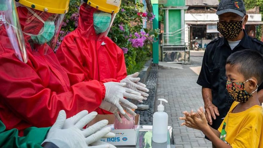 Trabajadores sanitarios enseñan a un niño a lavarse las manos. / © UNICEF/Fauzan Ijazah