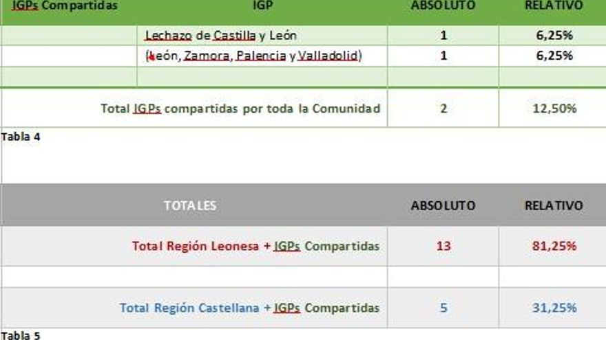 Así mismo, existen 16 IGPs (ver Tablas 2, 3, 4 y 5), de las que 7 son netamente leonesas, de la provincia de León. Esto supone el 43,75% del total de la autonomía.