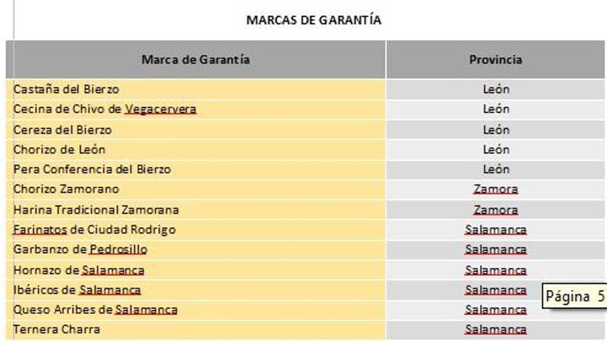 Existen además un importante repertorio de alimentos con Marca de Garantía (ver Tabla 6), y disponemos de otros alimentos diferenciales y característicos de esta Región que no están protegidos bajo un sello identificador como la Morcilla de León, la Androlla del Bierzo, el Chosco Omañés y Lacianiego, la Androja Riañesa, los Arvejos de Riaño, los Garbanzos de Pico Pardal, los Dulces de Patata del Bierzo Alto, las Peras Asaderas de las Arrimadas, las Castañas de Noceda, la uva Negro Saurí del Páramo de Payuelo, el alubión de Sanabria, el Lechón de Zamora y muchos más.