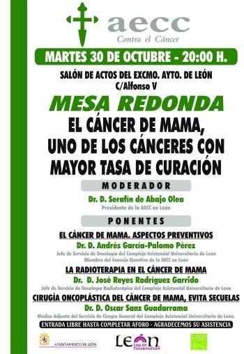 Dentro de las actividades de 'León, ciudad saludable', en colabora con la asociación Española Contra el Cáncer (AECC) en la mesa redonda “El cáncer de mama, uno de los cánceres con mayor tasa de curación' que tendrá lugar el día próximo martes 30 de octubre en el Salón de Actos de la calle Alfonso V del Ayuntamiento de León, a las 20.00 horas, con entrada gratuita hasta completar aforo.