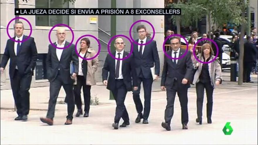 Los ex 'consellers' del Govern destituido de Cataluña (sólo falta Santi Vila) que han entrado en la cárcel. Captura de La Sexta.