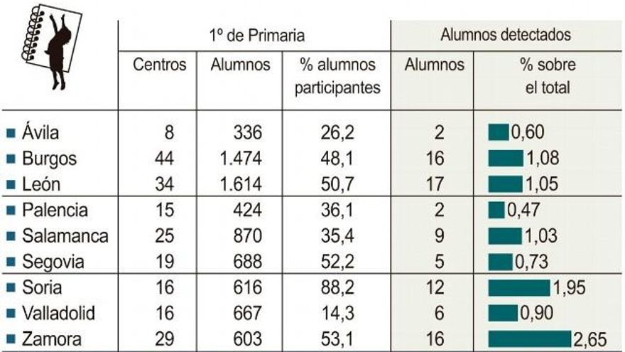 En cuanto al porcentaje de niños detectados, destacó Zamora, al duplicar, con creces, la media regional, hasta situarse en el 2,6 por ciento. Soria también estuvo por encima de la media (1,9 por ciento) mientras que Burgos, León, Salamanca y Valladolid se situaron en torno al uno por ciento. Los peores datos se registraron en Segovia (0,7 por ciento), Ávila (0,6 por ciento) y Palencia (0,4 por ciento).