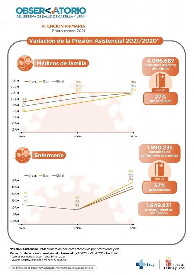 Respecto a Enfermería, el Observatorio de Salud de Castilla y León indica que de las casi dos millones un 57% han sido presenciales (856.000 por teléfono), en las que que han realizado 1,65 millones de procedimientos.