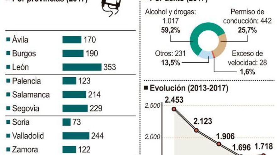 A pesar de las campañas de concienciación y del incremento de los controles por parte de la Guardia Civil, los positivos por alcohol y drogas continúan siendo la primera causa de los delitos y el pasado año dejaron 1.017 detenidos -24 más que en 2016-, que suponen el 59,2 por ciento del total. La segunda causa, al igual que en los últimos ejercicios, fue la de conducir sin haber logrado la licencia o bien por hacerlo habiendo agotado todos los puntos del carnet. En este caso se contabilizaron 442 imputaciones, 15 menos, que representan el 25,7 por ciento del total.