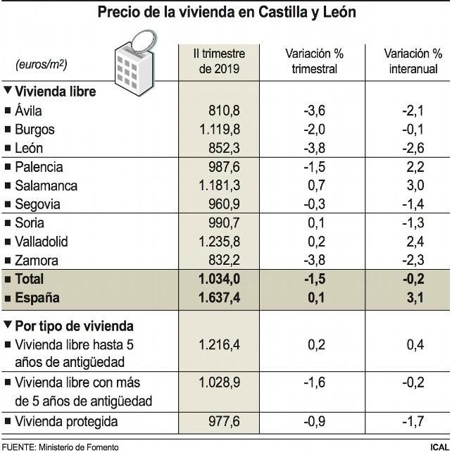 El descenso fue mayor en el caso de Castilla y León, donde respecto al mismo trimestre de 2018 cayó un 1,7 por ciento, hasta situarse en 977,6 euros el metro cuadrado. La mayor caída se dio en Burgos, donde alcanzó el cuatro por ciento ( 1.017,7 euros); seguida de Salamanca, con el tres por ciento menos (1.002,6 euros); o en Valladolid, con un descenso del 1,5 por ciento (1.042,2 euros). Por el contrario, aumentó en un 1,7 por ciento en León, hasta los 951,7 euros.