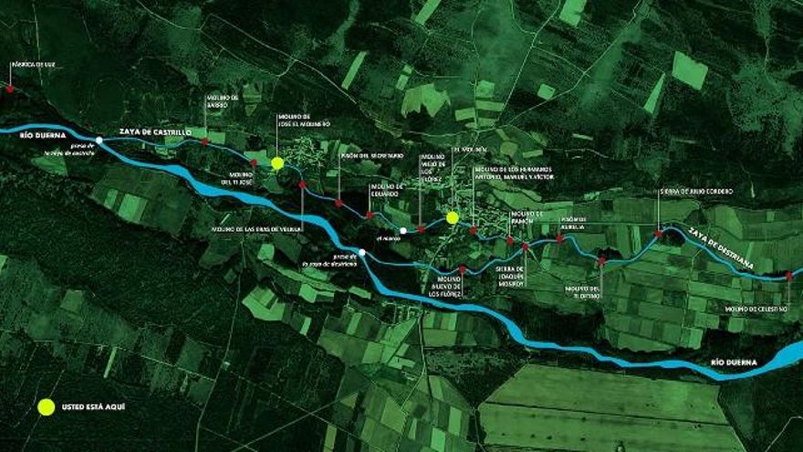 Jesús, ya en Velilla, enseña orgullo los molinos que se recuperaron y el panel de gran tamaño que hay a escasos metros de la zaya. Este panel, al igual que el situado en la plaza de Castrillo, señala los puntos en los que se encuentran tanto el río Duerna como las dos zayas, los molinos, las sierras y la fábrica de luz. “Con los escasos fondos que tenemos más las ayudas que solicitamos al Instituto Leonés de Cultura estamos adquiriendo molinos con el fin de restaurarlos y hacerlos visitables”, explica el alcalde mientras se despide de camino al ayuntamiento indicando que “es imprescindible poner en valor el patrimonio etnográfico que atesoramos a orillas del Duerna”.