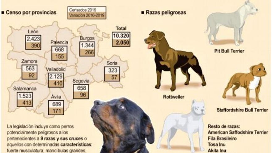 Los datos facilitados por la Junta de Castilla y León cifran a la provincia leonesa, vallisoletana y burgalesa como las que más número de estos animales residen en ellas, aunque solamente en el caso de la capital burgalesa, el registro municipal tiene inscritos a un total de 458 ejemplares. Entre las razas más destacadas se posiciona el American Staffordshire Terrier, con 163 perros censados, seguido por el Pit Bull Terrier, con 134, y Staffordshire Bull Terrier, aunque ya de lejos, con 44 canes. A la cola se encuentra tanto el Mastín Tibetano como el Bull Terrier, a razón de uno, respectivamente.