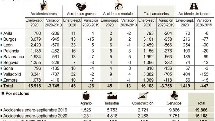 En datos globales, la siniestralidad labora se redujo un 23,6 por ciento en Burgos (3.101); un 22,4 por ciento en Salamanca (1.952); un 20,4 por ciento en Ávila (793); un 19,2 por ciento en Palencia (1.156); un 18,7 por ciento en León (2.459); un 17,2 por ciento en Valladolid (3.382); un 14,5 por ciento en Segovia (1.366); un 14,3 por ciento en Soria (810); y un 9,7 por ciento en Zamora (1.089).