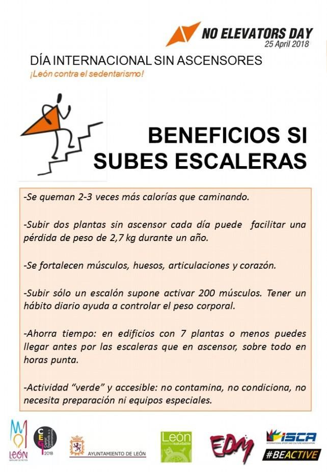 El Ayuntamiento de León se suma este año a las actividades del 'Día Internacional sin Ascensor' con la difusión, en 46 centros escolares del municipio y entre los casi 8.000 alumnos de las escuelas deportivas municipales, de una campaña divulgativa sobre los beneficios de subir escaleras como una manera de realizar ejercicio físico de manera diaria. El objetivo es que este miércoles toda la ciudadanía deje de utilizar ascensores, suba por las escaleras y valore incorporar este hábito saludable a su estilo de vida.