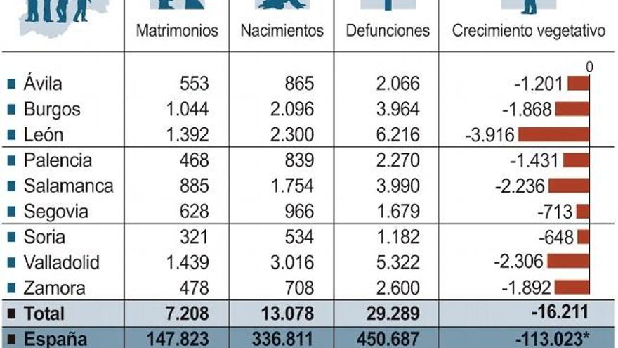 La Región Leonesa, con tres provincias, acumula prácticamente el 50% de la pérdida de la autonomía en crecimiento vegetativo. Las cifras negativas alcanzan 8.044 personas menos en el saldo 3.916 de León, los 2.236 de Salamanca y los 1.892 de Zamora. Las seis castellanas, 8.167.