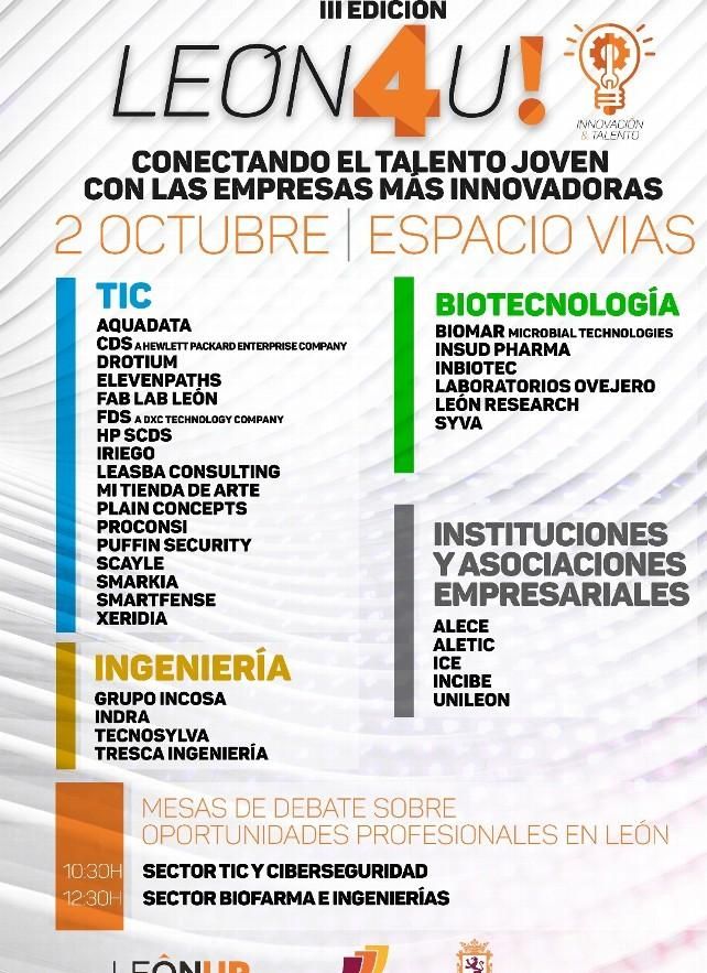'León4U Innovación y Talento' surgió de la inquietud de un grupo de empresas instaladas en León, con necesidad de encontrar profesionales cualificados y la intención de acercar su oferta a los jóvenes de la ciudad. El objetivo es que los jóvenes puedan hablar con directivos de las empresas y que les cuenten de primera mano cómo trabajan, qué perfiles demandan, qué estudios dan acceso a sus empresas y los planes de carrera profesional que pueden desarrollarse en León.