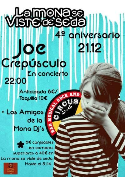 El sábado dia 21 de Diciembre la tienda de moda La Mona se Viste de Seda celebra su 4º aniversario y para ello contara con la actuación por primera vez en Leon de de Joe Crepusculo .Uno de los personajes más particulares y creativos del país.