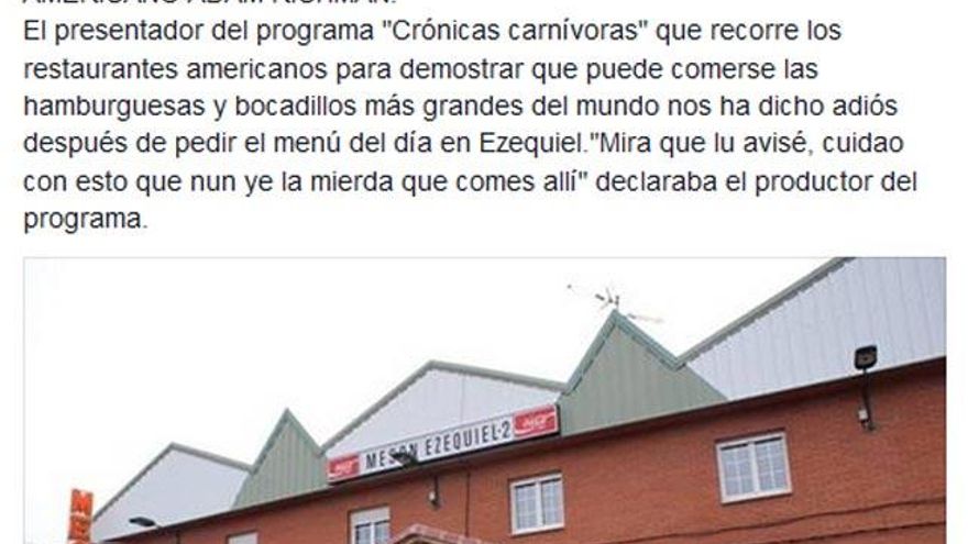 Es una noticia falsa, pero de las que llena de carcajadas. La publicación el pasado martes en la página satírica de Facebook La Crónica de Asturias de la noticia 'Muere de una fartura en el Ezequiel el presentador americano Adam Richman' ha creado un buen revuelo en las Redes Sociales leonesas y asturianas, y ha lanzado a la fama virtual al Mesón Ezequiel-2 de Villamanín.