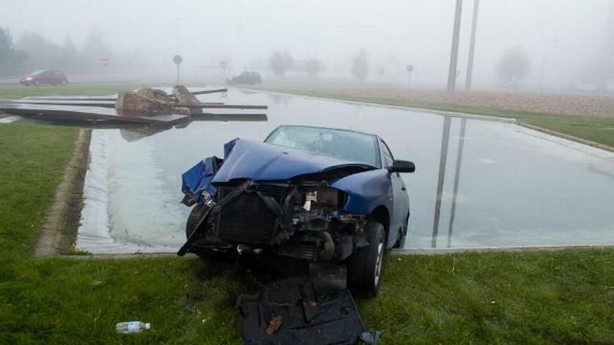 Una mujer ha sufrido un accidente al perder el control del vehículo que conducía debido a la poca visibilidad provocada por la niebla y no ha podido evitar una salida de vía hasta acabar chocando contra una farola y dentro del agua de la rotonda de Carrefour, en la capital leonesa. El accidente se ha registrado la mañana de este domingo hacia las 8.20 horas.