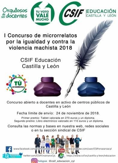 La Central Sindical Independiente y de Funcionarios (CSIF) anima a todos los docentes de los centros públicos de Castilla y León a participar en el I Concurso de 'Microrrelatos por la Igualdad y Contra la Violencia Machista 2018, una iniciativa que parte del sector de Educación en colaboración con la Secretaría Autonómica de Igualdad, con el fin de concienciar y visibilizar más un problema social gravísimo, que tiene que ver con la formación y la educación de las personas, “y sobre el que los docentes debemos incidir y llamar la atención”, apunta la responsable del sector autonómico de Educación en CSIF Castilla y León, Isabel Madruga. “Confiamos en la participación de los docentes, y en que esos relatos sean una aportación más para ayudar a terminar con esta lacra de la violencia machista. La educación de los niños debe ayudar a vivir en igualdad y con respeto hacia las mujeres”, añade.