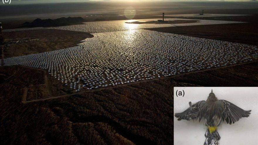 Las instalaciones de energía solar pueden causar la muerte directa de las especies aéreas que vuelan hacia la luz, como esta reinita de coronada quemada en el aire en Ivanpah, California. / Servicio de Pesca y Vida Silvestre de los EE. UU (a). / Estos parques solares crean un efecto lago. / Kerry Holcomb (b)