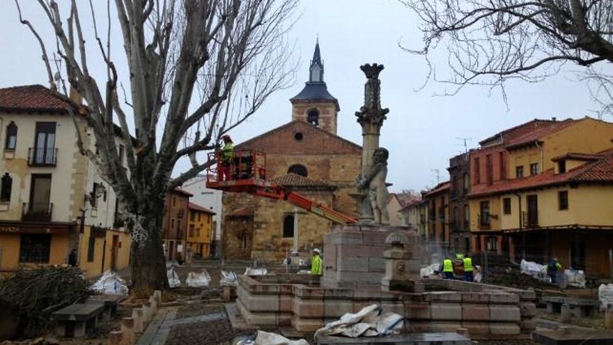 Rodeados de un zafarrancho de obras de la tercera fase, ajenos a una tras otra polémica que se vive desde hace un año en la Plaza del Grano, los dos álamos de este espacio están siendo sometidos esta semana a una poda acompasada al ritmo de los trabajos de una fase en la que se está levantando y reponiendo la totalidad del empedrado de cantos rodados que sobrevivió a la segunda fase tras la instalación de las contestadas aceras.