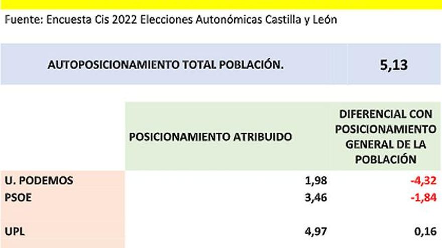 Considerando una escala de 1 (extrema izquierda) y 10 (extrema derecha) la población de esta autonomía se sitúa en el 5,13. Es decir en una posición de centro con una muy ligera inclinación hacia la izquierda (el centro de esa escala es 5,5). En esa misma escala a UPL se la sitúa en el centro alcanzando un 4,97. Esto supone que es el partido que en mayor medida se aproxima al posicionamiento general de la población (tan sólo un 0,16 de diferencia).