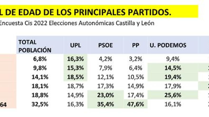 Si nos fijamos en la variable edad tenemos que el votante de UPL es fundamentalmente una persona joven. Un 31,6% de sus votantes tiene menos de 34 años y en ello se marca un diferencial claro respecto al 9,6% que tiene en ese segmento de edad el PP o el 12,1% de los votantes socialistas.