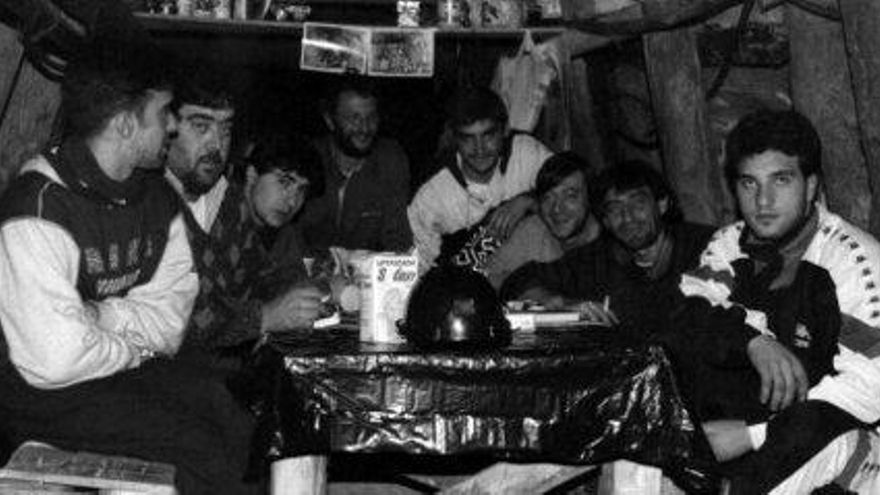 ICAL Siete de los ocho mineros encerrados en el pozo Mariángela de Santa Marina de Torre en 1994, junto al representante sindical Andrés Moreno, durante su encierro.
