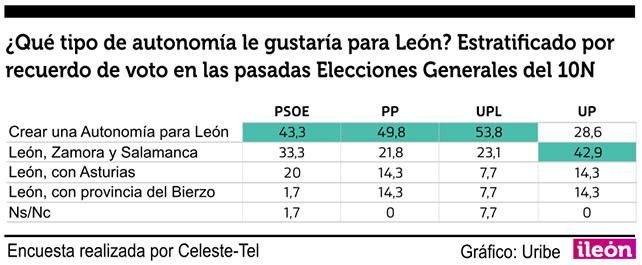 Los votantes del PSOE apoyan en dos tercios (66,7%) y apenas 6,7% se posicionan en contra la opción de la constitución de una mayoría absoluta aunque casi una quinta parte (18,7%) se muestran indiferentes. La 'cuestión leonesa' trascendió a la política nacional al apoyar el PSOE en el Ayuntamiento de León la moción de UPL sobre la autonomía para la Región Leonesa, con presiones de Ferraz y la dirección provincial para evitar que los socialistas la apoyaran. El Ayuntamiento de Urdiales del Páramo, bajo iniciativa del gobierno socialista, votará la moción pro autonomía este viernes.