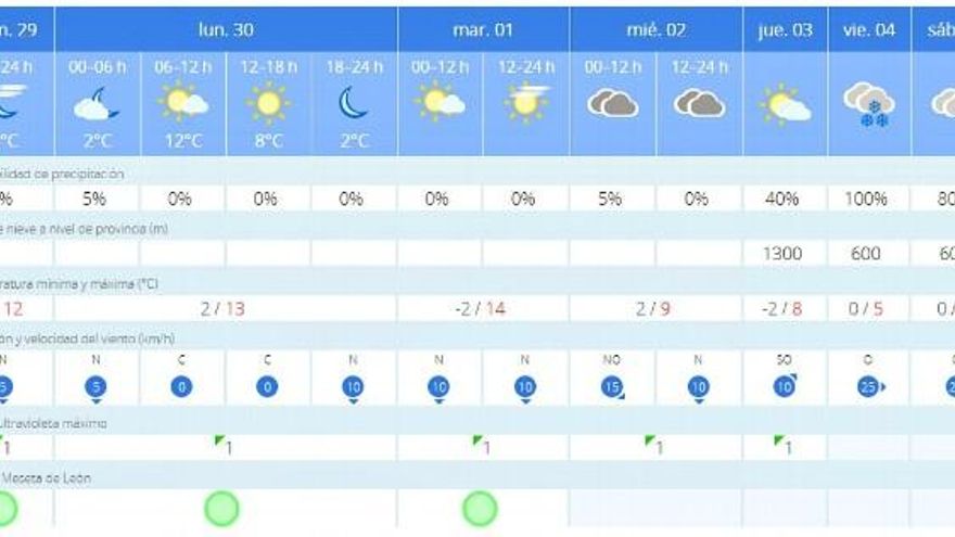 Para ese viernes 4 de diciembre la previsión de Aemet es que no sólo nieve copiosamente sino que lo haga en altitudes ya muy bajas, en concreto en torno a los 600 metros. Una altitud que, de cumplirse la predicción, dejaría ver nevar claramente en la capital leonesa, situada por encima de los 830 metros. La nevada podría incluso mantenerse el sábado 5, ya con menos intensidad pero igualmente sobre los 600 metros posiblemente. Sin embargo, siempre es necesario indicar que la predicción a varios días vista puede variar de alguna manera con el paso de los días y el recálculo de ciertos parámetros.