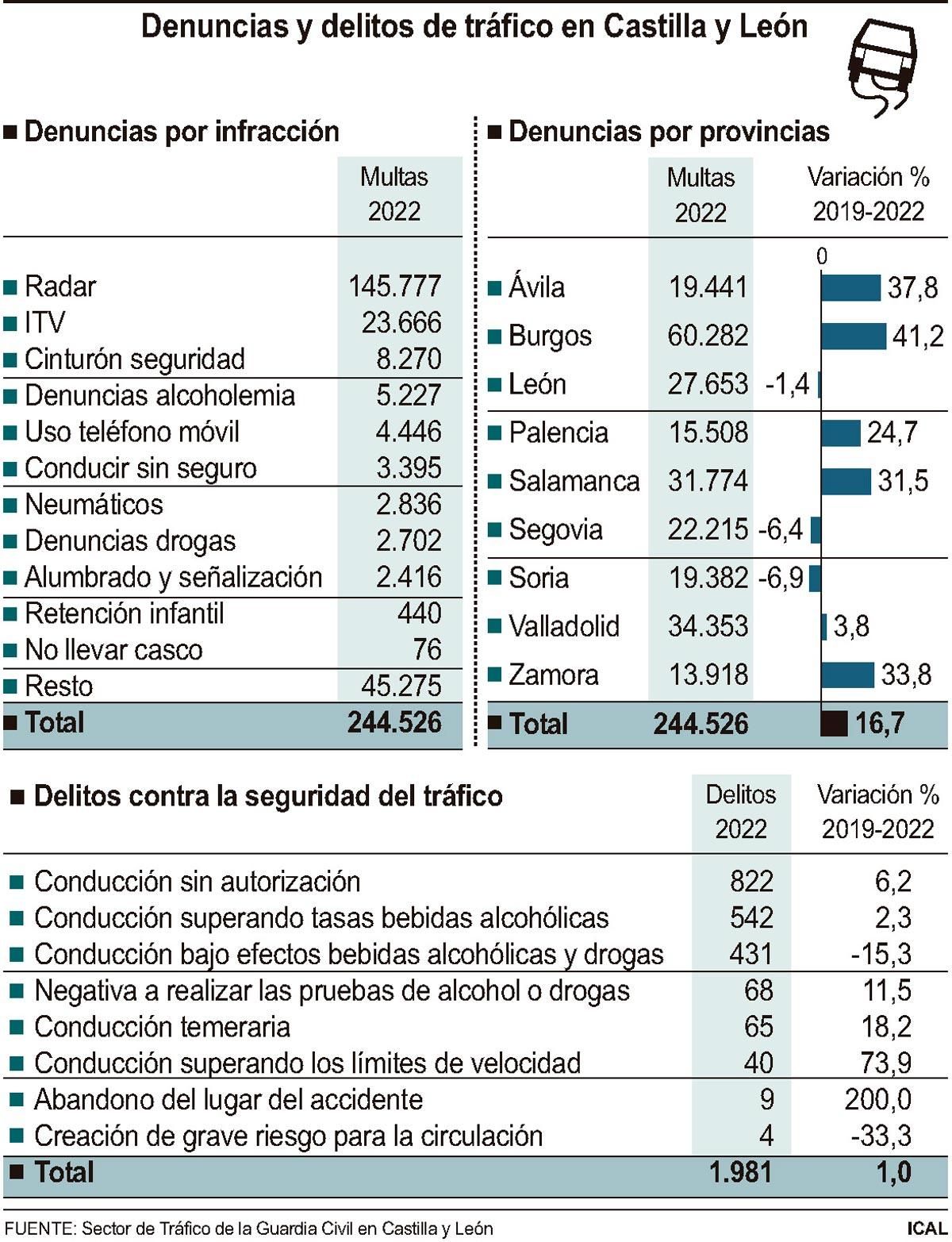 En la Comunidad autónoma de las dos regiones de León y de Castilla detectaron más de 145.000 vehículos por exceso de velocidad, un 48,7 % más que en 2019, mientras que el total de las denuncias rebasaron las 244.000, superando en un 16,7 % los niveles prepandemia, registrándose caídas en las multas por hablar por el móvil, no llevar puesto el cinturón de seguridad o por positivos de alcoholemia. Así, las denuncias en la región castellana ascendieron a 171.181.