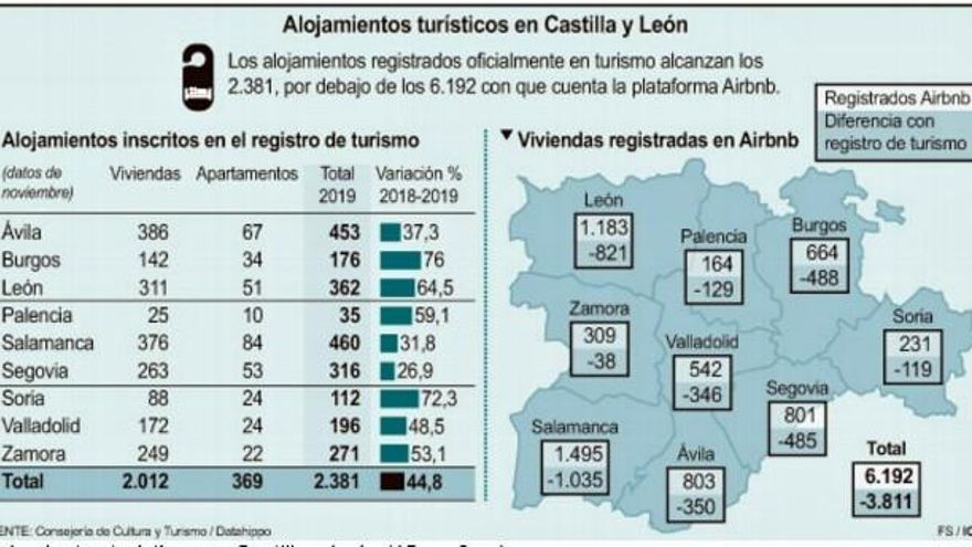 El portal DataHippo, un proyecto colaborativo que ofrece datos de diferentes plataformas de alquiler turístico, recoge que Airbnb oferta 4.903 apartamentos en Castilla y León por los 2.365 de HomeAway. Es más que probable que muchos de estos alojamientos estén en varios portales. Salamanca es la provincia de la Comunidad con más apartamentos ofertados, con 1.495, una cifra que difiere mucho de los 460 del Registro de Turismo de la Junta. Según este portal, hay más de un millar de establecimientos que estaría al margen de la legalidad que marca la administración autonómica.