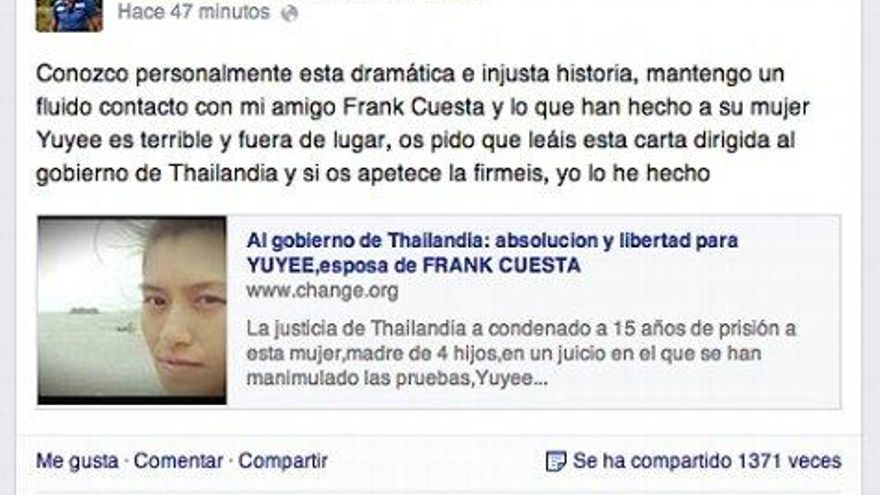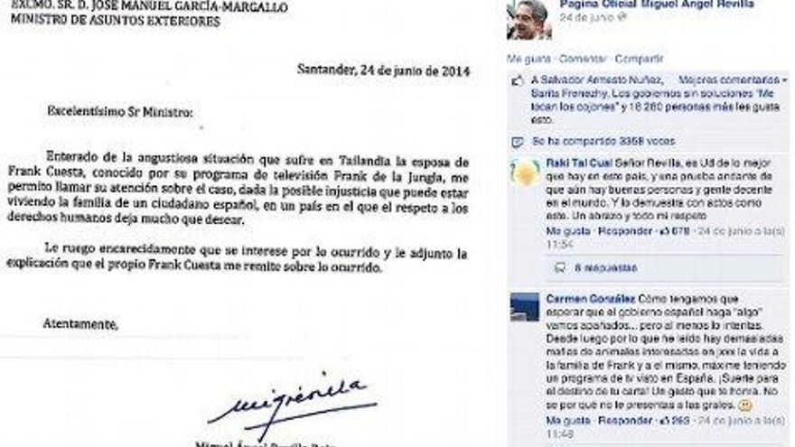 Este último 'colgó' de su muro de Facebook la petición de ayuda que recibió a través de una carta de Frank Cuesta. Revilla decidió exponer allí, en su perfil, la situación de injusticia que el leonés dice estar viviendo pero no se quedó ahí: el político cántabro emitió una carta dirigida al ministro de Asuntos Exteriores del Gobierno español, José Manel García Margallo, transmitiéndole “la posible injusticia que puede estar viviendo la familia de un ciudadano español”.