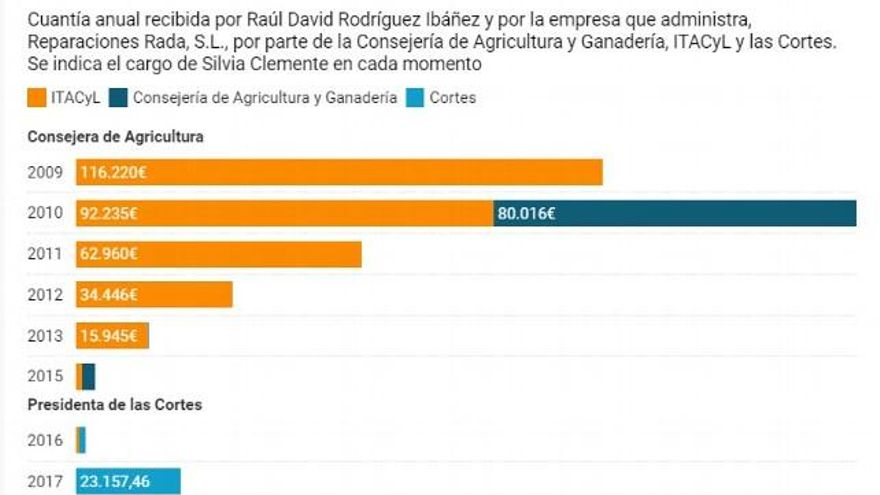 Tal y como informa eldiario.es/cyl, el contratista de las obras de ampliación en la casa de los suegros de Clemente, Raúl David Rodríguez Ibáñez, realizó durante una década trabajos para la Consejería de Agricultura primero y para las Cortes de Castilla y León después, durante las etapas en que la entonces dirigente del PP estaba al frente de esas dos instituciones. El montante total de sus facturas abonadas por ambas instituciones entre 2009 y 2018 es de 459.058,14 euros.