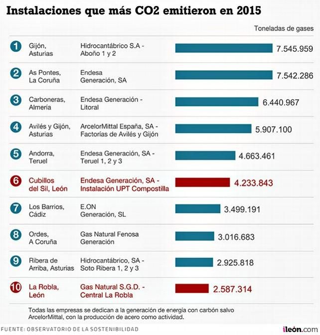 Como es obvio, se trata de la central térmica de Compostilla, que Endesa tiene en la localidad berciana de Cubillos del Sil, de la que anualmente salen a la atmósfera 4,2 millones de toneladas de CO2; y la térmica de La Robla, de Gas Natural, con casi 2,6 millones de toneladas a su vez. La central berciana apenas se ve superada por otras cuatro en toda españa y la roblana ocupa el puesto número diez en ese ranking nacional, siempre según el informe mencionado.