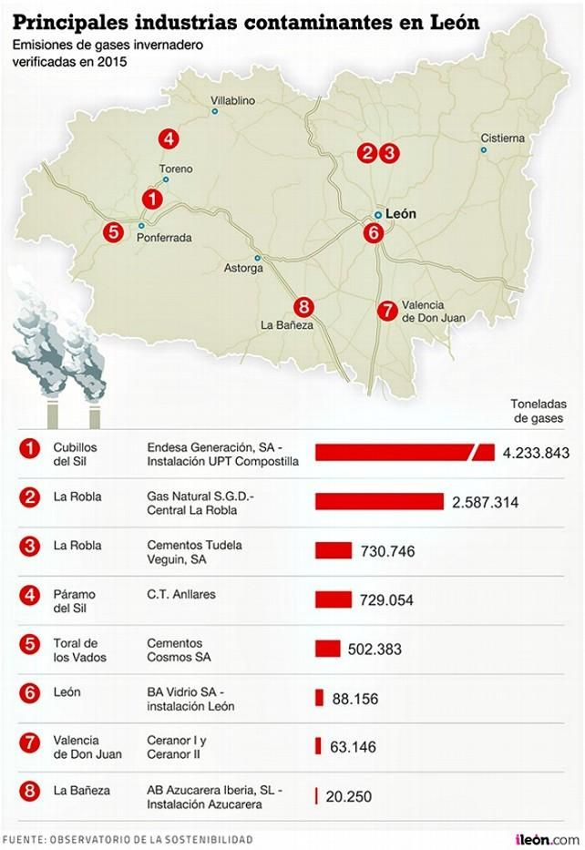 Cerrando la lista leonesa de la contaminación industrial, la fábrica de Vidrio SA en la capital leonesa con 88.158 toneladas/año; las factorías de cerámicas y ladrillos de Ceranor en Valencia de Don Juan, con 63.146 toneladas/año; y la Azucarera Iberia SL de La Bañeza, con apenas 20.250 toneladas/año.